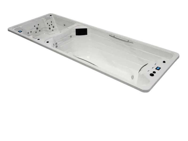 Zanurz się w oazie wellness z Aquavia Spa swim spa Duo. Ten innowacyjny basen ze spa łączy w sobie dwa oddzielne obszary: jeden do pływania w przeciwprądzie i aquafitnessu, a drugi do zanurzenia się w świecie hydromasażu. Dzięki dwóm całkowicie oddzielnym strefom każdy może dostosować temperaturę wody do swoich potrzeb. Podczas gdy jedna osoba ćwiczy z potężnymi dyszami przeciwprądowymi, druga może cieszyć się rewitalizującym masażem w ergonomicznych fotelach i leżance do hydroterapii, wszystkie wyposażone w zagłówki dla maksymalnego komfortu. Swim spa Duo oferuje kompletne doświadczenie z 30 punktami masażu w strefie hydromasażu i 16 dodatkowymi punktami w basenie aquafitness. Zanurz się w magicznej atmosferze dzięki chromoterapii i dźwiękowi przestrzennemu Bluetooth. Posiada również ekskluzywne technologie Aquavia Spa, takie jak dezynfekcja UV, solidna obudowa i izolacja termiczna EcoSpa zapewniająca oszczędność energii na poziomie 69%.