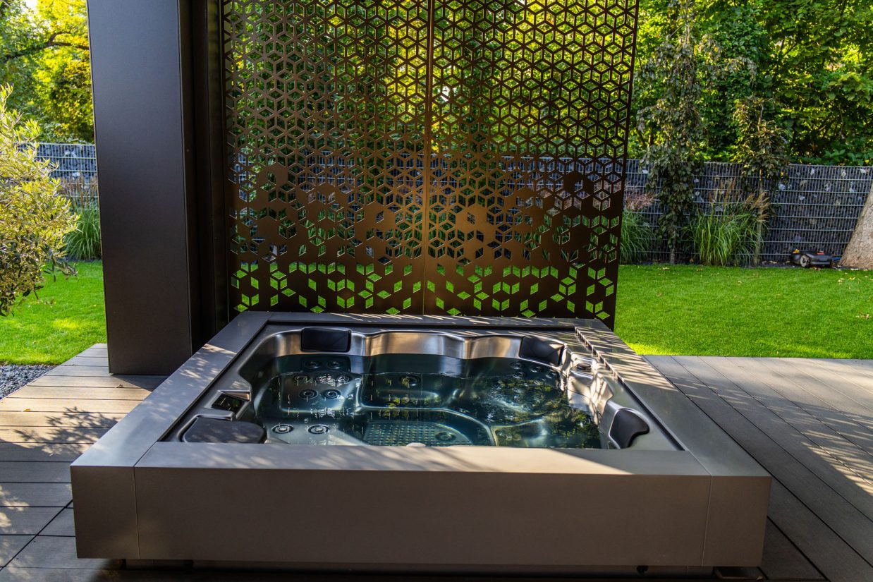 Powstała elegancka, zewnętrzna strefa relaksu, w której Cube Ergo wygląda jak integralna część tarasu. Częściowe wpuszczenie, minimalistyczna zabudowa i ażurowa osłona tworzą spójny projekt: nowoczesny, funkcjonalny i bardzo „premium” w odbiorze.